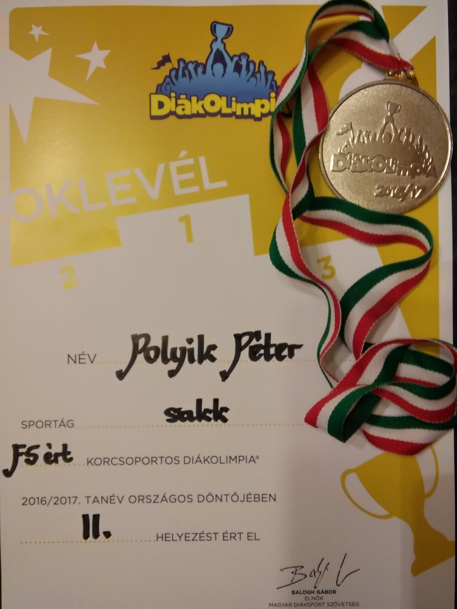 Az országos Sakk Diákolimpiai döntőben Polyik Péter (10.a) a
