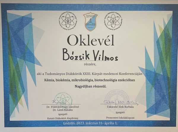Bózsik Vilmos 12.c osztályos tanuló az idei tanévben Kémia, biokémia, mikrobiológia, biotechnológia szekcióban nevezett a TUDOK2023-ra. Kiváló pályamunkájával bejutott a döntőbe, melyet 2023. március 31.-én rendeztek meg Gödöllőn.