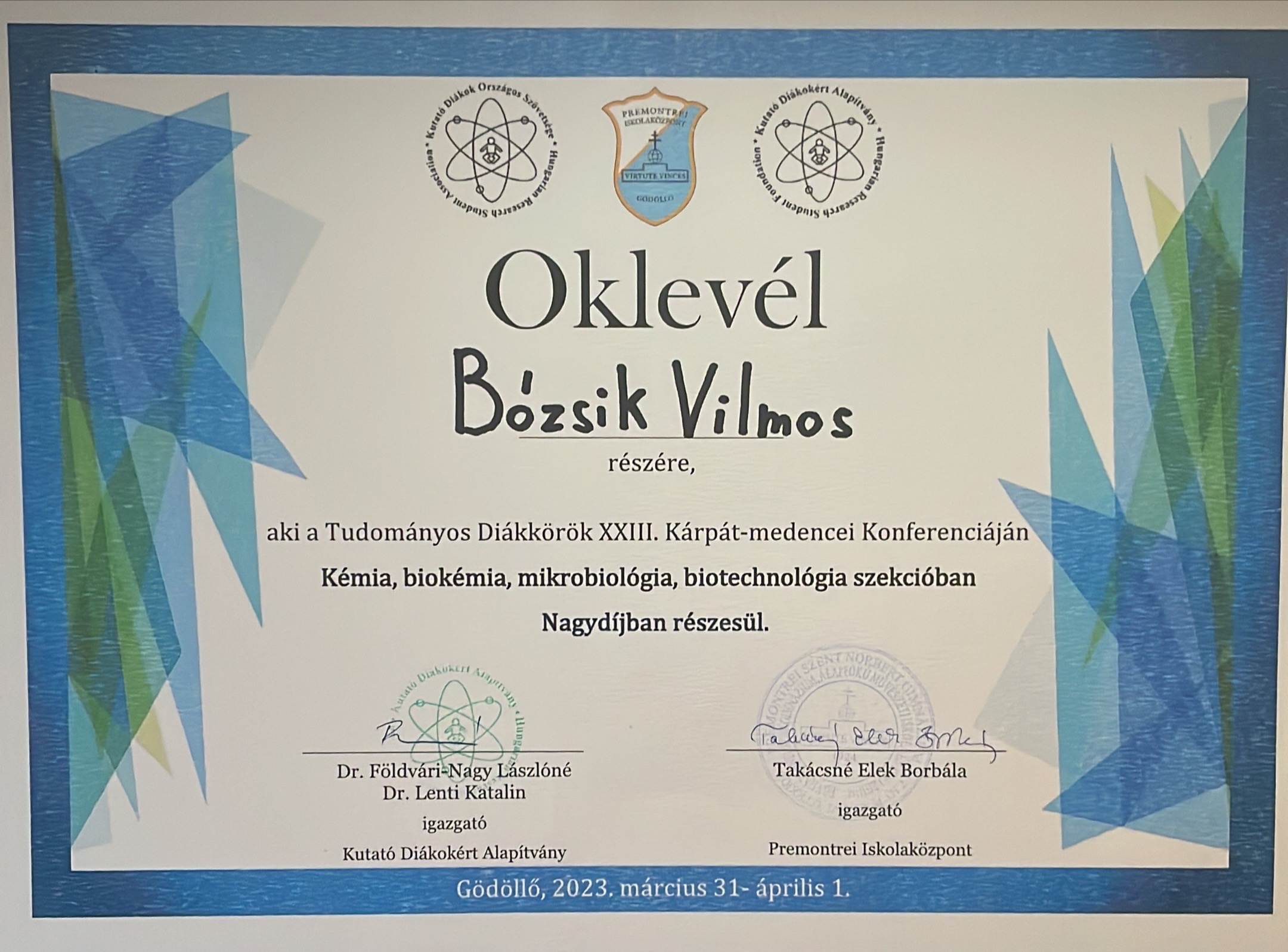 Vilmos a döntőben nyújtott szép teljesítményével a Kémia, biokémia, mikrobiológia, biotechnológia szekcióban Nagydíjban részesült.