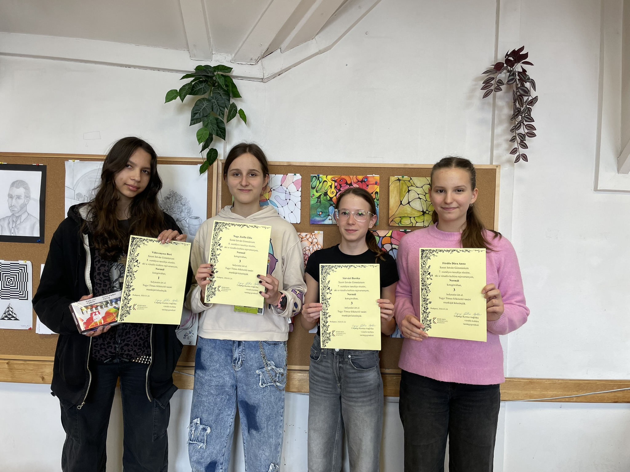 Nagy öröm, hogy az idei tanévben 10 diákunk is kipróbálta magát a 7–8. évfolyamos kerületi rajzversenyen. A színvonalas, ötletekkel teli alkotások közül a verseny végén a legjobb 4 munka (évfolyamonként 2) kerülhetett továbbküldésre. Az ünnepélyes eredményhirdetésre múlt héten került sor a Dr. Mező Ferenc Általános Iskolában, amelyre minden diákunk meghívást kapott. Fördős Dóra Anna (7.a), Sárvári Boróka (7.b) és Nagy Zsófia Zília 3. helyezést, Vidovenyecz Bori (8.b) 1. helyezést ért el.